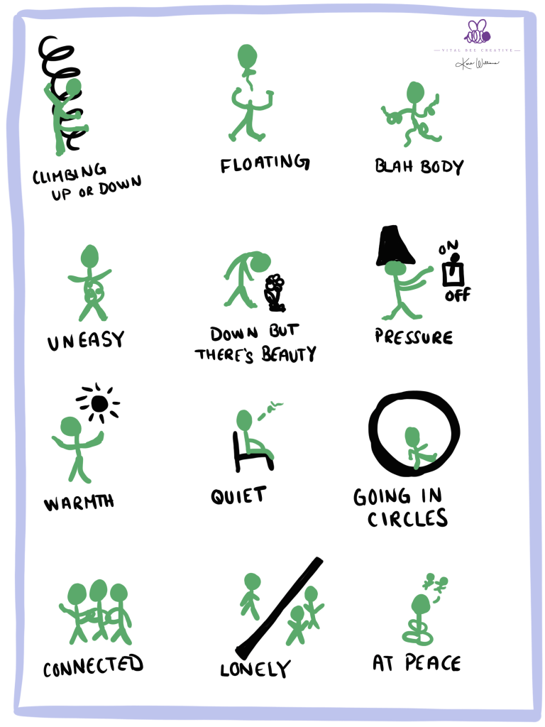 A HMMM Option: Draw out some stick figures beforehand (or use the ones I drew) and display them on the screen. Kick off the meeting by explaining which one you’re relating to most today and why. Then invite others to share if they’re drawn to any of the other figures and how they’re interpreting that figure. You could even nudge them to draw their own stick figure if none of yours are a match.