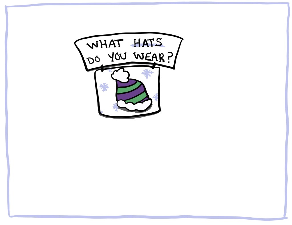 This week, the volunteer has designed an activity to hear from everyone about what’s been going on in their worlds 🌎 lately. This activity is asking “What Hats 🧢 Do You Wear?” with a specified time frame (this week, this month, etc.) and widening the question to include hats at work 🏢 and at home 🏡. What is shared will be captured with visuals and words. The benefits are:
