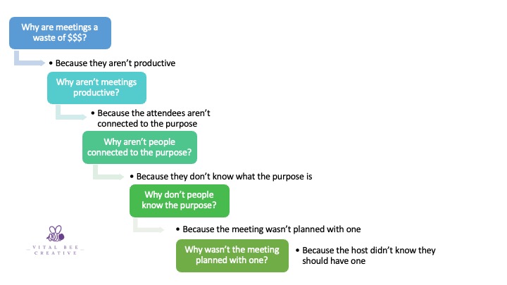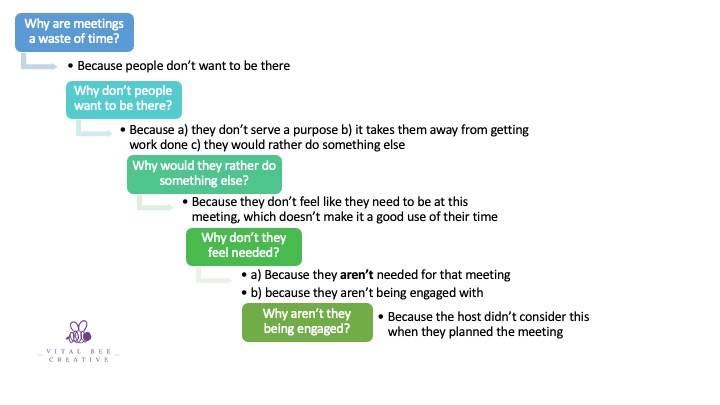 A HMMM Option: Then you ask yourself “wow, why are meetings like this?” So you use a Continuous Improvement exercise, the 5 whys, to identify the root cause of why meetings are so unproductive. You reflect on this visual and decide to start planning your meetings to have a purpose and engagement.