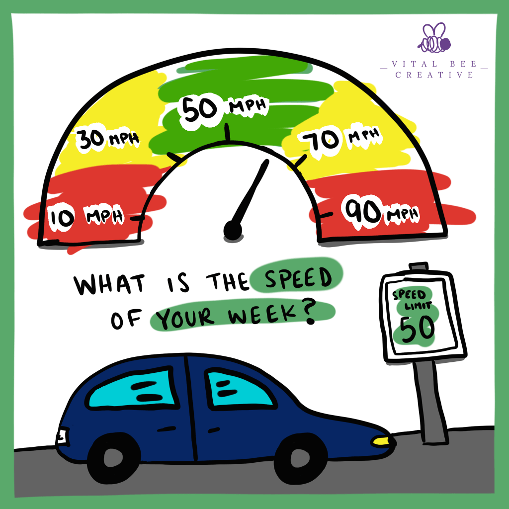 A HMMM Option: You ask what their week’s speed is. Start the conversation by sharing that the expectation is 50MPH. Then have the team indicate where they are on the scale using an image similar to the one below.