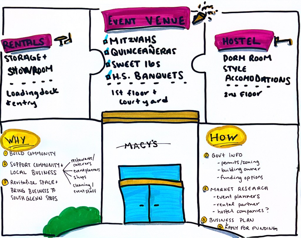 INSPIRATION: Yesterday I met with the Mayor of Centennial to get feedback on a business development idea I have. I brought this visual along with me as a guide. I had this ideas months and months ago and couldn’t let it go, so I made a rough pen sketch so the idea would live on paper instead of my head. The thought still nudged me, so I requested a meeting to find out more on next steps and turned my pen sketch into something much more visual for this conversation with Mayor Piko.
